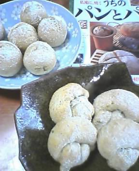 成型は小さいまん丸型とひも結び型。「私流に焼くうちのパンとパイ」という本を参考にしました。ひもを結んだ形の成型って、こんな風にするのかぁ・・・と初めて知ったら、もうやってみたくやってみたくて・・・