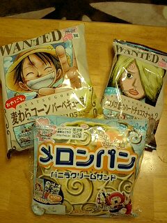 ローソンのワンピキャンペーン楽しみにしていたんだけど安静生活で買いに行けなくなっちゃってパパさんも土日とも仕事・・・また買えずに終わっちゃうのかなぁ~って思っていたらパパさんが会社帰りに買って来てくれました(1人で買うのは恥ずかしかっただろうね~( ̄w ̄)ぷっ)前回のおにぎりとかは本当にもう・・・可愛そうな味だったから(笑)こういうお菓子の方が絶対良いと思うわ~ゴムゴムメロンパンはちゃんと中も渦巻きになってて欲しかったメリー&サニー前回のキャンペーンのティッシュを大事に大事に使っててそろそろ底が見え始めていたからこの2種類はとっても嬉しい~これから少しずつ商品が出てくるということでフランキーのコーラがとっても気になる私です浮気してゴメンネ(笑)ローソンのワンピキャンペーン
