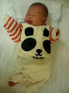17日に出産した Y江ちゃんが日曜日に退院してしまうので床上げ前だけど 少しだけ銀太マンをお祖母ちゃんにお願いしてその友達と 20日に出産した Aかちゃんの赤ちゃんを見に行かせてもらいました。Y江ちゃんは男の子 Aかちゃんは女の子2人とも色が白くて髪がフサフサ羨ましい~3週間しか違わないけど身体の動きを見ていると銀太マンは確実に成長してるんだなぁ~と実感しましたその後 大急ぎで バブっちとアフロのお墓参りも済ませて久々のお出かけは終了~ほんの3時間程度のお出かけだったけどめちゃくちゃ疲れちゃったあと二日で床上げだけどちゃんと社会復帰できるのか ものすご~く不安ですそうそう我慢できなかった・・・以前 FIVEKIDSで見かけたパンダのカバーオール・・・やっぱり欲しくってパパさんが出かけたついでに買って来てもらっちゃった銀太マンすげ~顔してる(笑)
