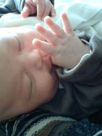 お腹が減った~と泣き出したので準備が出来るまでお祖母ちゃんに抱っこされていた銀太マンお乳を探してパタパタしていたら偶然指が入っちゃった~ちょっと可愛かったので記念にパチリ