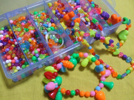 知り合いのお子さんにKちゃん(小2)という女の子がいます。Kちゃんはビーズアクセサリーを作るのが大好き。「norikoちゃん!いっしょにビーズしよう♪」と、きれいなビーズを持参して遊びに来てくれました。そのキレイなビーズを見たおチビ!!「うっっっわぁ~☆きれいだねぇ~(嬉)。ボクもやるっっっ!!!」でも。細かいビーズは3歳の子供にはちょっとムリ。おもちゃのビーズなら・・・と大急ぎでダイソーで調達してきました(笑)先日、仙台の七夕祭りへ行くときに、おチビがおじいちゃんにもらったお小遣いの残りで購入。さすがダイソーさん!種類がたくさん!いっぱい入って¥105!!画像のビーズはダイソーで調達してきたおもちゃビーズ3種類(¥315也)です。おチビ作のブレスレットとネックレス(笑)すごいセンスですが、もんのすんごい集中力で作り上げました。楽しかったようです☆男の子でもキレイなものは大好きなんですねぇ自作のネックレスとブレスレット、私が作った指輪(2個)をつけてお約束の電車で遊んでいました(笑)育児日記人気blogランキング ポチッと応援お願いします☆