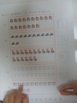 いつも親ばか育児日記にお付き合いくださって、ありがとうございます。今日もいつもどおりの親ばか日記です(*^^*ゞ今日は幼稚園から帰るなり、引き出しの底に眠っていた公文の「かずかぞえ」ドリルをひっぱりだしてきたおチビ。このドリル、数の数え方を教える教材として以前に購入したのですが、数かぞえを教えるには、ドリルではなく日常のもので教えようとしまいこんでいたものでした(やさしいかずかぞえ(3・4・5歳))いったいどういう心境の変化でしょう。知らん振りしてほっておいたのですが…鉛筆を持ち出して、なにやら書いています。文字はかけないはずだし、一生懸命何をしているのかな~と覗いてみると…おおおおっっっ!!!おチビ「いち、に、さん・・・」おチビに覆いかぶさるようにして写真を撮ったので、ちょっと画面が暗いですが見えますでしょうか…「むむむむ…」 ↓「できた♪」数字になってるっっ!!母は読めるぞっっ!!だけど、いつの間に書けるようになったの??幼稚園で教えたのかしら?おチビに聞いてみたのですが、幼稚園ではやってないとの事。どうやらドリルの下のほうに書いてある数字をまねっこして書いたようです。教えなくても、やる気になれば自分から書こうとするんですね~育児日記人気blogランキング ポチッと応援お願いします☆[おまけ]ECCジュニア(英語教室)のCMに出ている木佐彩子さんに「英語が好きですか?子供が好きですか?」と問われ、「どっちかなー」と真剣に悩んでいるおチビでした。(そして「おかあさんはおチビが好きよ♪」と答えて、おチビに「違うでしょ?英語か子供だよ!!」と叱られている母です。)