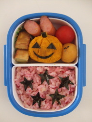 今日はハロウィンでしたね。寝坊しました。おチビのお弁当の日なのに(-"-;A ...こんな日は「やっつけお弁当」です。冷蔵庫にあるもので、お弁当に入れられるものは何でも入れてみます(笑)で、今日のお弁当はコチラ↓ひゃーぁ!はずかしい" "(/*^^*)/お弁当を作ってる間に「あ、今日はハロウィンだ!」と気がつき・・・かぼちゃをコネコネ。のりをチョキチョキ。かぼちゃの下には底上げ用にナゲットを仕込んであります(笑)ご飯は五分づきのご飯に「ミツカン おべんと畑」を混ぜました。緑の彩りがないのがきになりますね~出来上がったお弁当を見たおチビ「わぁ~!早く食べたいなぁ~」合格だったようです(o^-^o) 夕方、おチビのお友達が「トイ・ストーリー」のバズに扮して来てくれました。「トリック オア トリート・・・(ボソボソ)」恥ずかしかったみたいですσ(^_^;)来年はおチビもなにかに変身してみる?と聞いてみましたが、あっさり「やだo(>_