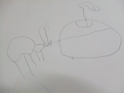 今日は、久しぶりにおチビ画伯の絵をご披露させていただきます。以前の「ぞう」の絵よりちょっとは進化してるでしょうか?(笑)【タイトル】りんごをたべるあり【解説】タイトルどおり、りんごを食べてるありさんの絵です。 ありからしゅっぱつして、りんごを横切っている線はありの舌だそうσ(^_^;)【タイトル】ちょうちょ【解説】ちょうちょというより蛾のようですが・・・ 画伯が「ちょうちょ」というので、ちょうちょなのでしょう。 孵化したばかりなのか、羽がひろがってませんねぇ。【タイトル】ぶぅちゃん【解説】どう見ても「ぶた」さんですね。 自己主張しているお鼻がそれ以外のなにものでもありません。【タイトル】ひこうき【解説】 どうかな?飛行機にみえますでしょうか? 乗り物を描くのはとても楽しいようです。 実はこの後、色んな付属品がついてしまい飛行機の原型がなくなって しまいました。実は、この絵たち・・・↓こーんな虎の巻を参考に描きました。『1日10分でえがじょうずにかけるほん』(3歳~6歳対象)絵を描くのにお手本は入らないでしょう!というのが、私の考えなのですが本屋さんに行ったときに、おチビにねだられたパパが「買ってもいいよ」と言ったために、購入にいたりました。でも、これのおかげで絵らしい絵になるので、おチビは楽しいみたいなんです。お手本どおりに描いた絵は、必ずと言っていいほどお手本とは程遠い絵に。どんどん書き足してしまうから(*゜.゜)ゞそれはそれで、良いのでしょうね('-'*) 育児日記人気blogランキング ポチッと応援お願いします☆
