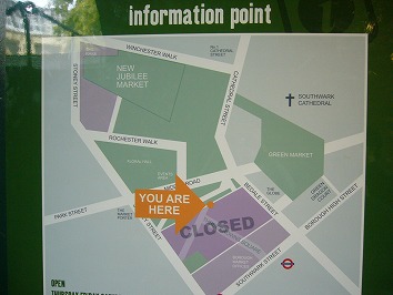 イギリス旅行もとうとう最終日。朝からバラ・マーケットに向かいました。ロンドン・ブリッジ駅から歩いて徒歩数分。それらしきものがあったのだけど、何とマーケットの場所が移転したという看板が・・・一瞬あせりましたが、移転先はすぐ近くでした看板の地図に従い、たどり着くことができました。『食のマーケット』というだけあって、バラ・マーケットは本当に食材の宝庫のようでした。きっといろいろ食べたくなるだろうと思い、朝ごはん食べずに来たのでお腹がペコペコでした。いろいろ物色したあと、牛肉とラム肉のハンバーガーと、ホットドッグ、おやつにブラウニーとエクレアをいただきました(お腹すきすぎてがっついたので写真を撮り忘れました・・・)すごいおいしかった満腹になったところで、またまた見学・・。お魚屋さん。見たことのない魚がいっぱい。いろんなきのこが・・・食べてみたかった! おいしそうなお菓子がたくさん エッグタルトかな? なんだか撮影してました。料理番組かしら? バラ・マーケット、また行ってみたいマーケットです!イギリス旅行も最終日。この日の夜の飛行機で帰りました。 2度目のイギリスでしたが、もっといろいろ見たいところがたくさんあります。是非また行きたいな。