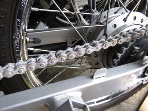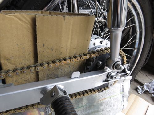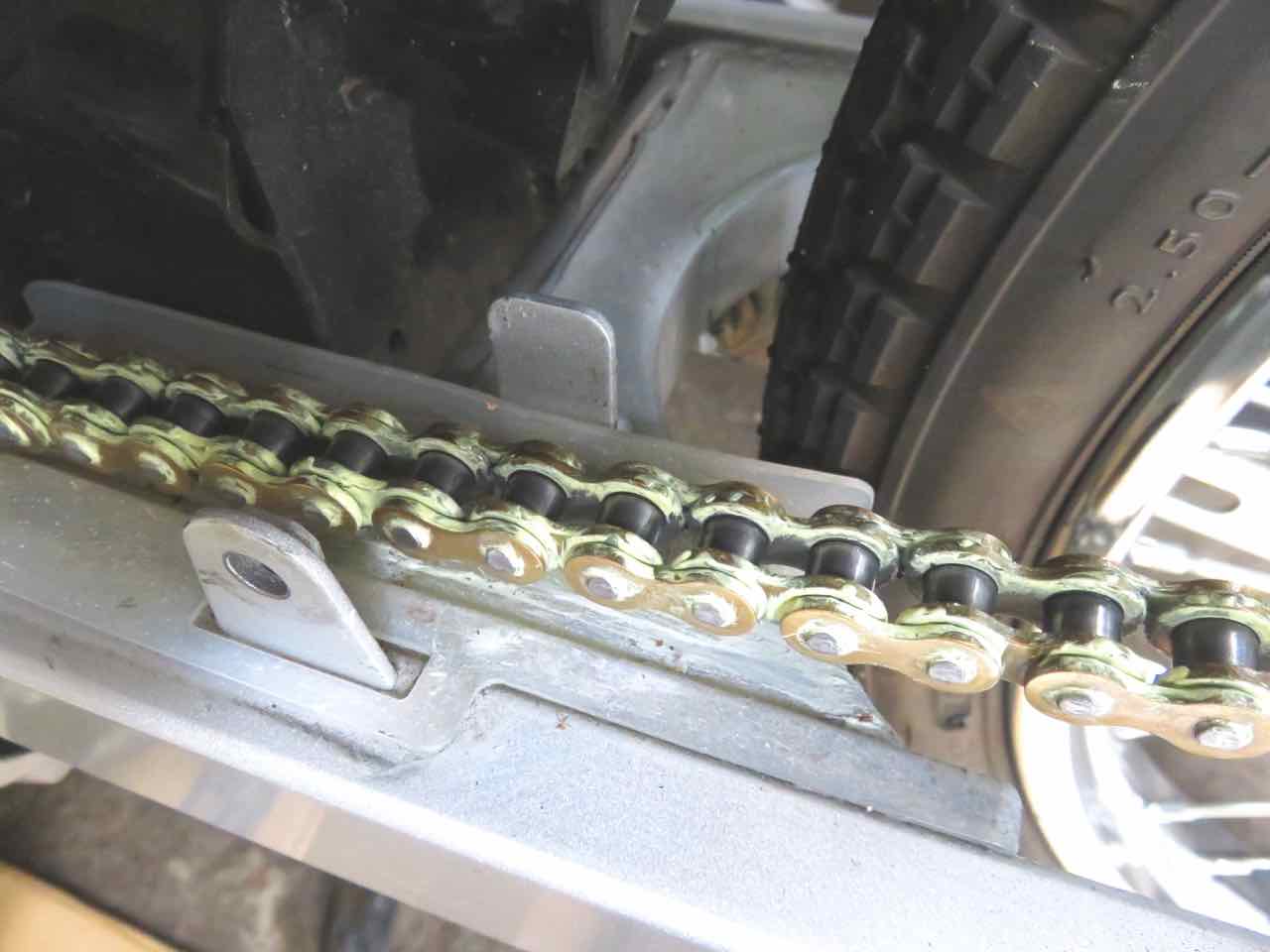 朝から早起きして、白かぶのチェーンメインテナンス作業に入っています。意外に寒い大阪・山の中。夜明けすぐから起きていたのですが、結構な冷え込みに恐れおののいて、スタートが遅れてしまいました。(笑)白かぶを納屋の入り口に配置して、サイドバッグを取り外し、チェーンカバーを取り外し、まずは内部の観察です。前回のチェーン洗浄から1100km、前回注油から800km走行していましたが、意外に程度は良好な感じ。素人判断ですが、ヌチャヌチャしていて油ぎれはなく、もちろんサビもなく、カバーへのチェーンルブの飛散も許容範囲。見よう見まねでやってはいますが、それほど悪くはないようです。特筆すべきはチェーンのたるみ。ゴールドチェーンに変更してから、全く調整なしで経過しています。やっぱりゴールドチェーン・・・優秀ですね。今回の状況から、1000km毎のチェーン洗浄、500km毎の注油サイクルで、メインテナンスは良さそうですね。少し安心しました。今回は間に合いませんでしたが、パーツクリーナーと歯ブラシを使って、ちゃちゃちゃっとチェーンの洗浄を完了。束の間のゴールドチェーンの復活です。またどうせホワイトルブを塗りますから、綺麗なゴールドはすぐに隠れてしまいます。(笑)さあ、第2ラウンドの始まりです。ゴールドチェーンにホワイトチェーンルブを塗り込んでいきましょう!*へぇ~とか、うんうんと思われたら、こちら↓をポチッとおねがいします!*にほんブログ村