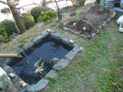第4池を作りカメを飼うというプラン、これが中止となりました。いろいろな理由はあるものの、問題となるのはそこからくる「水問題」。畑に使用するための水がめを去年、木小屋の脇に作りました。そこに第4池を作るのであれば、木小屋に樋をかけていったん水がめに引き、そこから第4池に注ぐような水の流れを考えていました。しかしそのプランが破談となり、木小屋の樋はかけたとしても逆方向に水を引くことになります。すると水がめを常に満たすだけの水の供給を維持することが出来ない・・・・そこで考えたのが隣接する第2池の排水。これを80リットルの水がめに引き込めば、水換えの際にだいたい120リットルくらいは水を捨てますから十分使えます。毎日ジョウロで10L使ったとしても、毎週水換えをすることになりますから大丈夫。というわけで、さっそく第2池の配水管を延長してみました。その距離およそ3メートル。ちょうど勾配がついていますから、いったん流し始めればサイホンの原理でグイグイ水換えができるはずです。排水スピードも今まで以上にアップすることでしょう。明日は一度試運転をしてみようと思います。楽しみですね〜〜〜〜!(コイさん7匹がいる第2池と畑とはこうして隣接しています)(その脇にある水がめに、こうして第2池からの排水ホースを延長して突っ込みました。これで水の有効利用ができます!)*へぇ~とか、うんうんと思われたら、こちら↓をポチッとおねがいします!*にほんブログ村