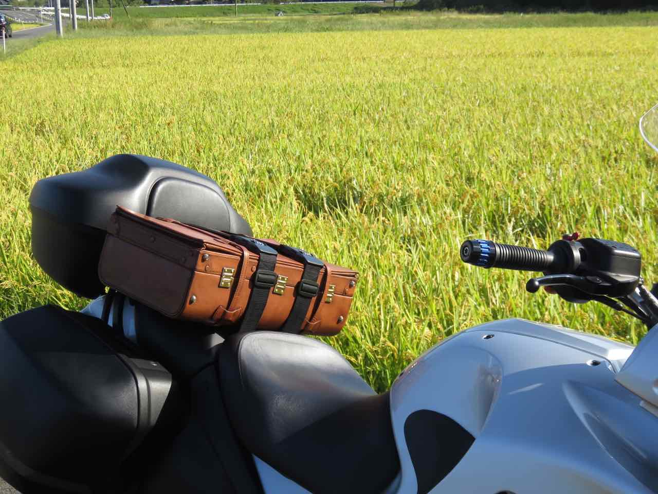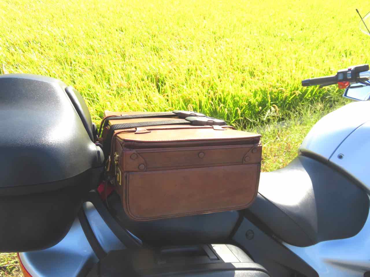 (旅バイクに革のトランク。その行き先が「実家」になっても、私にはなんの迷いもありません。それで十分。銀ちゃんも革のトランクも、きっと喜んでいてくれることと思います(笑))