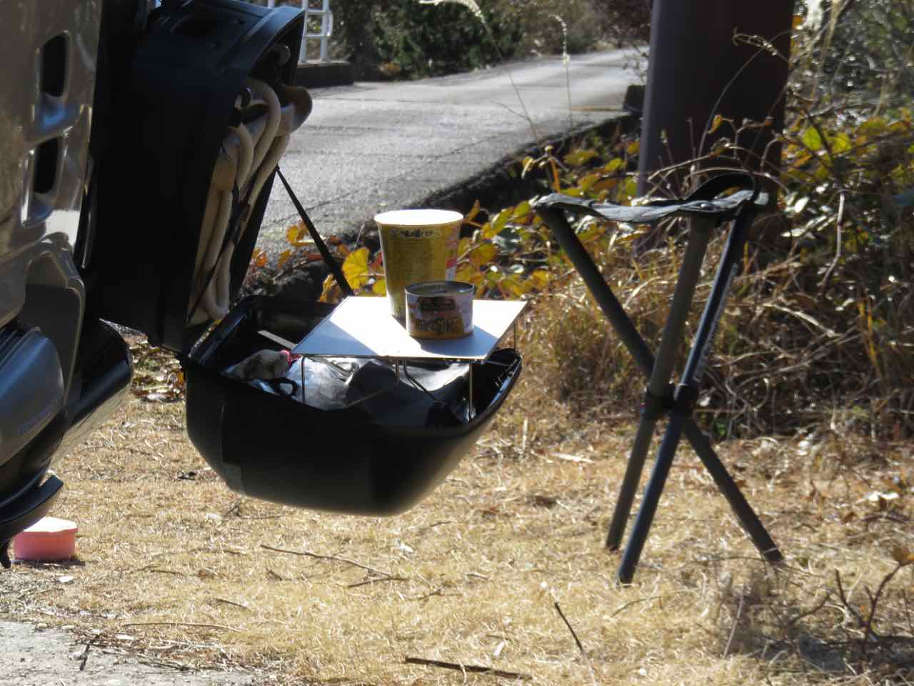 サイドスタンドを立てて銀ちゃんを左に寝かせた状態で、左パニアを開放し、そこにホップアップテーブルを載っけると、ある程度の水平を保った簡易テーブルが設営できます。