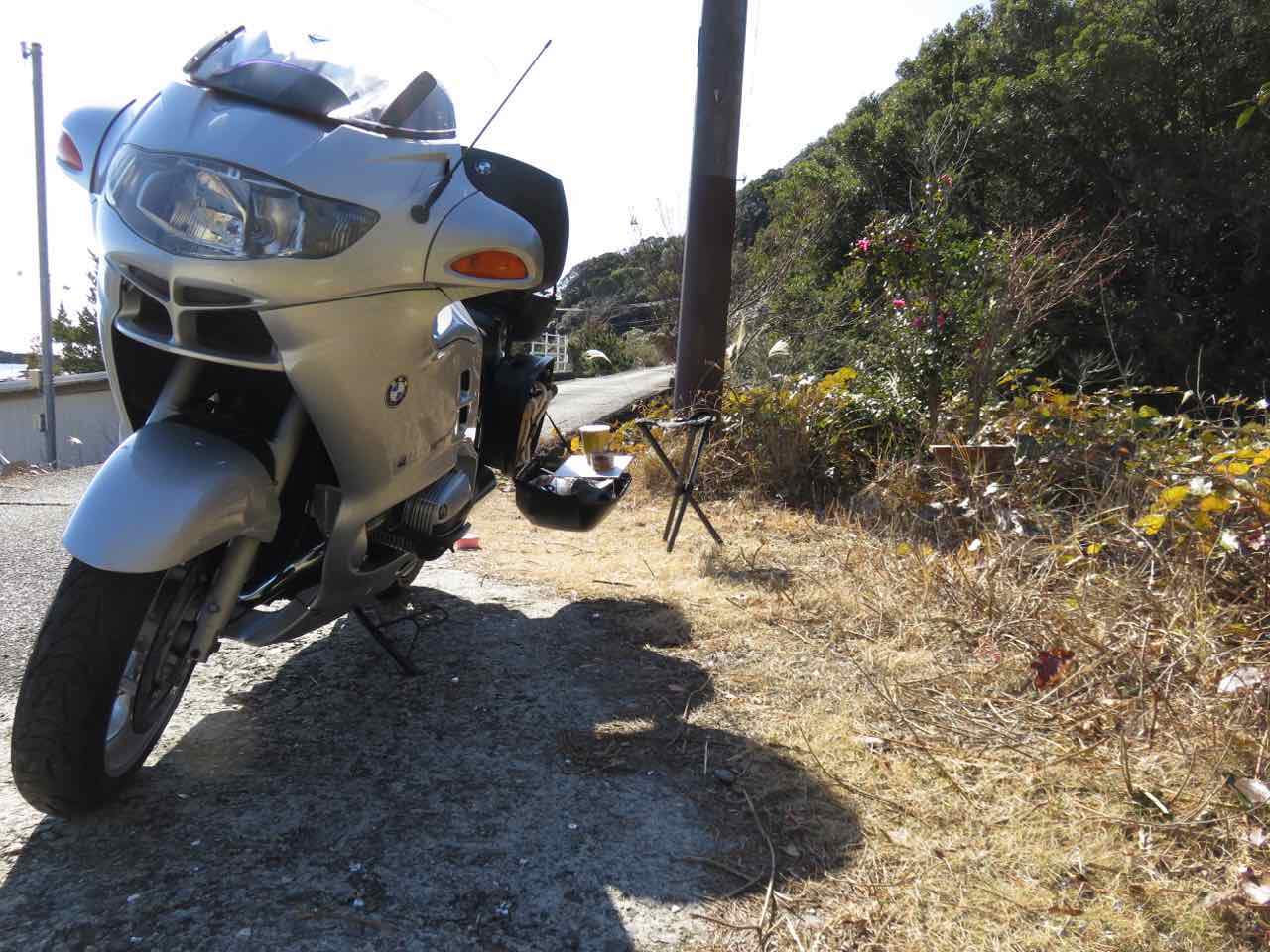 (相棒であるバイクのすぐ横で飲食できる幸せ・・・これもこのやり方が優れているポイントの一つです。景色を愛(め)で、バイクを愛(め)でながら、食事を楽しむ・・・。 バイク乗りにとってはとても幸せなひとときです(笑)。ぜひ、お試し下さい!)