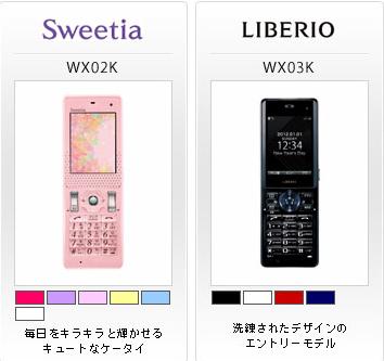 WILLCOMプレスリリース 株式会社ウィルコムおよび株式会社ウィルコム沖縄(以下、ウィルコム)は、「WX02A<Sweetia>」および「WX03K<LIBERIO>」(いずれも京セラ株式会社製)の販売を11月10日以降順次開始いたします。