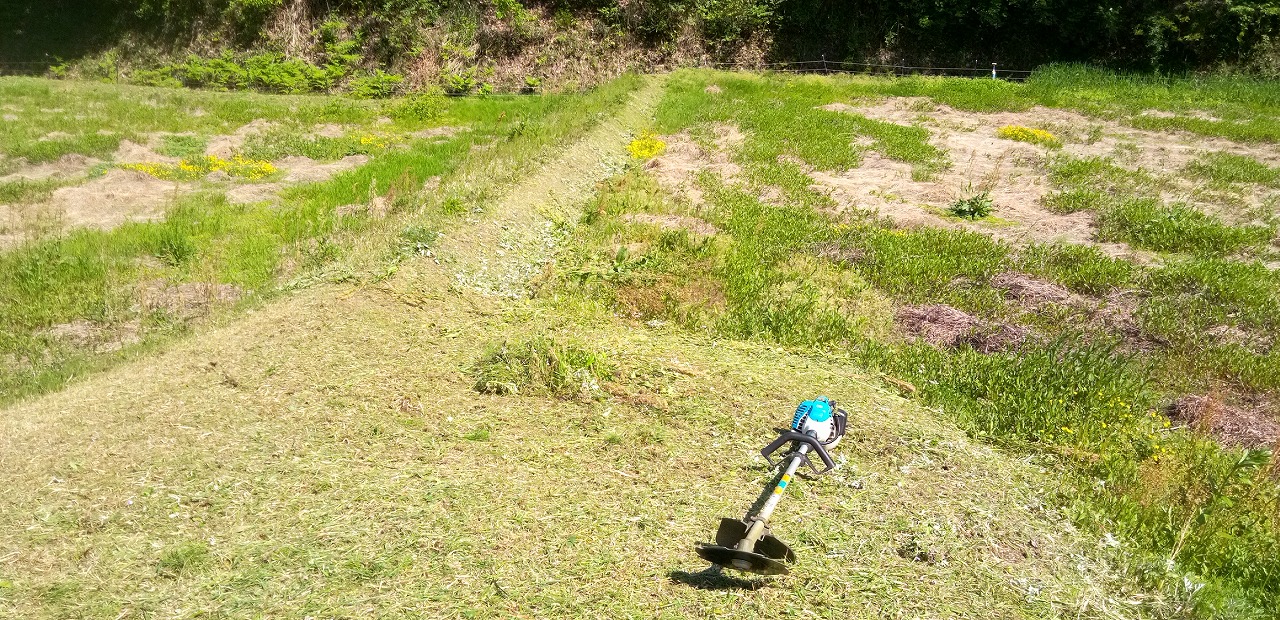 >草刈りが忙しい時期になると雨が嬉しい。雨の日は草刈りがお休みです。暑い日は長くて2時間が限度ですね。田んぼの周辺は土手が多いから大変です。足腰が鍛えられると思って頑張ってます。 >草刈りの目的は草を短く刈ること。なんだけどね。僕はきれいに刈らないと気が済まないんです。刈り残しがあると引き返してでも刈る(笑)変なところにこだわりがあるんですね(笑)でも面倒臭いと思ったらそのままです(笑)
