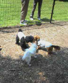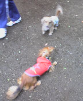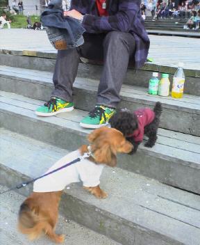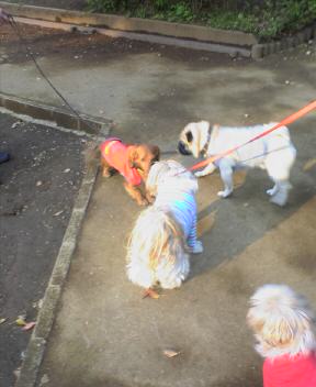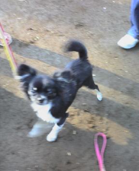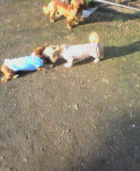 今日もいい天気夕方いつもの広場へ直行すると、シフォン 「あ、ルビーちゃんだ、あそぼー」ルビーちゃん 「また、きたわねー。 いつでも相手したげるわー」ルークくん 「また始まっちゃたよ・・」ハブくん(パグ) 「女の戦いは怖いな・・早く帰ろうっと」シフォン 「あ、あのひと誰?」シフォン 「あたしシフォン、よろしくねっ」マックスくん 「あ、どーも。マックスです」ウリュウくん 「僕も仲間にいれてよ」フィラくん 「なんでこんなにダックスばかりなんだ」