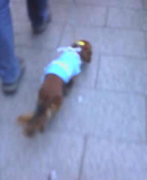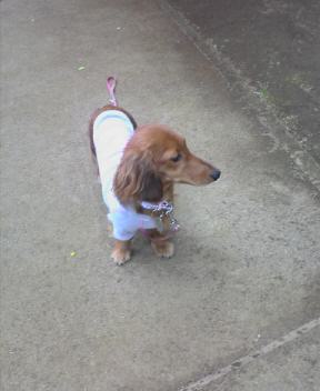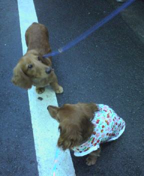 わーい、今日は朝からとってもいい天気。あんまり暑いから、お散歩は夕方に。ママが洗濯物とりこんでから、でかけようとしたら、( ̄ロ ̄ll)ガーンそれもどしゃ降りでも6時すぎたらやんだのでまだ道はぬれてたけどあ散歩に出かけたの。そしたらいつもの広場で、ルーク君に会ったのルーク君はあたしより17日おにいちゃんで1歳になったばかりの、シャイでクールなイケメン。一緒に散歩デートしたんだ帰ってきたら服はびちゃびちゃだったけどとっても楽しかったよ