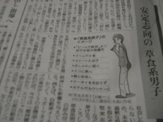 こんにちは、シフォンママです(o*。_。)oペコッ今日読売新聞を読んでたら、こんな記事が出てました↓[安定志向の「草食系男子」]すきあらばオオカミに変身するところが、羊のようにおとなしいまま=そんな態度で女性に接する若い男性が増えている。異性と友達感覚で付き合い、酒を飲んでも乱れず、堅実な暮らしぶりが共通点。↓中の挿絵をアップにすると↓どこかでみたことのあるイメージそう、文章の内容も人物像(挿絵)もにいたんソックリにいたん、いつのまに取材されてたの?