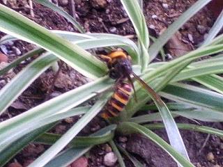 虫の苦手なかたはご覧になりませんように☆彡外出しようと玄関のドアを開けた子どもが叫びながら戻ってきました。「スズメバチがいる!」以前ミツバチに刺されたことのある次男はブルブル・・・のぞいてみると、よろよろしたスズメバチが玄関前にいます。白い発砲スチロールの箱でつついてみましたら箱にしがみついてきます。ちょっと哀れになって姫しゃらの植木鉢の根本に落としました。するとオリヅルランにしがみつつ、するすると葉先に移動していきます。これは意外に回復して、飛び立つかもしれません。すると、おかしな動きをしました。急いで植木鉢の縁に移動し、ぶら下がるようなかっこうで上をうかがっています。かまきりがやってきたのです。カマキリは目を合わせながら、時折じりっと間合いを詰めていきます。スズメバチは魅入られたように動けません。しばらく膠着状態が続きました。私はなんとなく発砲スチロールでスズメバチのお尻をつつきました。スズメバチがモゾモゾ動きました。カマキリが襲い掛かりました。蜂のくびれたところをしっかり押さえます。ああ無情。時折 パリっ・・ポリっ・・という小さい音が聞こえます。3時間後両者の姿は見えませんでした。
