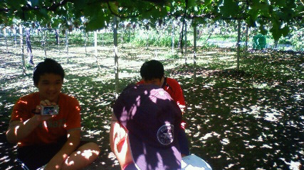 家族全員が休みの唯一の昨日、山梨にぶどう狩りに行きました朝一番で勝沼のメルシャン・ワイナリー見学ツアー。勝沼にはワイナリーがいろいろあり、他のところでも見学ツアーができるようです。一宮御坂に進み、ぶどう狩りと桃狩りです。 今の季節、ぶどう狩りより桃狩りのほうが人気があるのかしら。試食は白桃でした。がりがりと固い桃の皮をむきますが、さわやかな甘みでおいしいです昨年の秩父の圃場と違い、土がふかふかしています。雑草も生えているし除草車が置いてある。除草剤は使っていないようです。さわやかな木陰でずーっとおしゃべり。園内食べ放題プランで巨峰を選びましたが、一房が大きくて食べきれナイヨー昨年はマスカット系だったせいか3房ぐらいはいただきました。巨峰は甘味が強いです。ちょっと赤・黄色がかった品種、りんごのようなさわやかな味わいでおいしかった。甲斐路が掛け合わせてあるのでしょうか。↓隣は桃園。桃もおいしそうですよね~葡萄でおなかがいっぱいになってしまったので、桃狩りは断念しました。来年は桃にしましょうぶどうを堪能した後は、まぴ★さんに教わった「桔梗屋本店」へ。ここは売り場のほか、食事処2つ、規格外品などがお買い得なアウトレットコーナーがあります。おなかいっぱいなのに「ほうとう」が食べたい・・・子どもたちは「地鶏のほうとう鍋」で自分たちでダシから取ってじっくり煮込みました。 カボチャが煮溶けた味噌味がなんとおいしいことでしょう!具もたっぷりです。ここでゆっくりして13時。この日の夜、一宮では大文字焼きや花火があるのですが、天気予報では「雷・雹」なので早めに帰路につきました。高速ではなく、昔ながらの甲州街道を行く道。楽しい一日でした