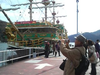 富士山が大好きな父のお供で箱根に行ってきました。カメラとビデオをよいしょとかまえる父にとことんつきあう私。親孝行ができました2月の平日。3か月前になります。直前に雪が降った週で、湖畔にも雪が残っていました。芦ノ湖といえば海賊船。毎回乗ってしまいます。父もタクシーの人に「高速艇もあるけど、やっぱり箱根と言えば海賊船だねー」と話しかけていました。でもお父さんたら、これ西武系列のタクシーなんですよ、悪いですよ運転手さんも無言です。 (海賊船は小田急系、高速艇は西武系)駒ケ岳ロープウェイの上からの眺めは素晴らしい。むこうに富士山、ふりかえれば海のあちらに房総半島が見えます。1日目の夕方に登ったら逆光でしたので、2日目の朝にもう一度登りました。 泊まったのは芦ノ湖湖畔、プリンスホテルの近くの竜宮殿(新館)です。香の薫りが漂う、気持ちよくすごせる旅館でした。水族館は大きくなっていてびっくりです。子どもたちが小さかったころに入って、がっかりした覚えがあります。だって体育館のような広い部屋に、大きな四角い水槽が並んでいて、それぞれ魚の値段が書いてあるのです。金魚屋さん!?ペットショップ??でも今回はリニューアルされていて見ごたえがありました。大きな魚が回遊していたり、アシカ(アザラシ?)のかわいいショーもありましたよ。普通の水族館になっていました。家族で泊まりに来て、あいにく雨に降り籠められてしまっても水族館で楽しめますし、そのほか陶器の絵付け体験コーナーやパン屋さんなど遊ぶところもありました。そして山を越えて、宮の下のホテルでティータイム。古くからあるホテルとして有名ですが、裏のお庭が広いんです。借景も素晴らしい。温室もあります~ 銀のポットでサーブしていただけるコーヒーをゆっくりいただきました。レンタインデーが近く、箱根はスウィーツフェアでした。ホテル内の売店にあるクッキーが、とてもおいしかったさあ、帰ります。お父さん、元気で長生きしてくださいね~。GARASHIさんへのおみやげショットです ↓ 春日部大凧マラソンおつかれさま
