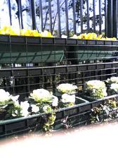植え込みのところどころに パンジーと葉牡丹の植木鉢が並んでいます。
