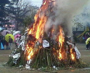 小雨のなか、次男は火の神の一人で火をつけました。