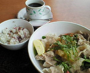 冷たいサラダスパ。豚しゃぶ、さらし玉葱、トマト、紫蘇、ロケッツ、大根おろしでさっぱりいただけます。梅ごはんの小丼も。