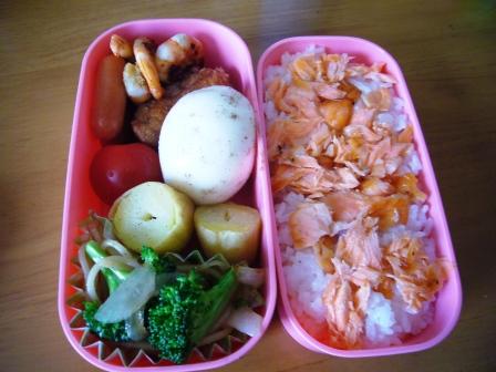 おはようございます昨日は凄い雨風でしたまるで台風鉢植えのゆりが倒れてしまい、あわてて起こす。しかし…しばらくするとまた倒される。場所を変えてみる。でも倒れる最終的に紐でくくりました。さて今朝は6時前に目が覚めてしまいました6時に目覚ましがセットされてるのですが、なんだか不安で。もしかしたら6時過ぎてるかも…。目覚ましが聞こえなかったかも…。目覚ましをセットし忘れたかも…。不安にかられて飛び起きる時計を見ると、あぁ6時前だ……。こんなんで大丈夫だろうか?仕事初日、そんな日に限って寝坊とかしてしまいそう。不安に襲われる朝なのでありました本日は娘ちゃんがお弁当なので、2度寝無しウインナー 唐揚げ 海老のカレー炒め ゆで卵 こふきいも トマト ブロッコリーのパスタ シャケご飯私の今朝の朝食はバナナ1本と水でした。