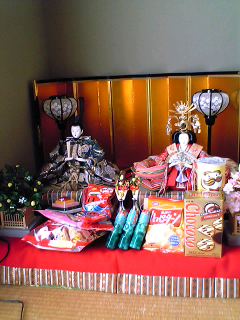 、今日は娘にとって5回目のひな祭りおじいちゃんにケーキを買ってもらったので、夕食のあといただきました~。とてもおいしかった!!毎年、あわててだすんだけど今回はちゃんと節分の後、出しました。いつもお菓子などおいてあげるのですが今年は2.3日前から しかもとってつけたようにおいてしまった。せっかく早くから(いつもより)だしてあげてたのに。今日中か明日の朝には しまわなきゃいけないのよね~。お雛様が終わったら次はお兄ちゃんたちの兜だわ。そうそう、こいのぼりは何歳までだしてあげればいいのかしら・・・主人はもういいやろーというのですが 私的には次男が小学校卒業まではだしてあげたいなー。兜は私だけでも飾れるけど こいのぼりはポールが重いのでどうしても主人の手が必要だし、せっかくおじいちゃん達に買ってもらったしちなみに昨日、保育園で娘がお雛様を作ってきました~