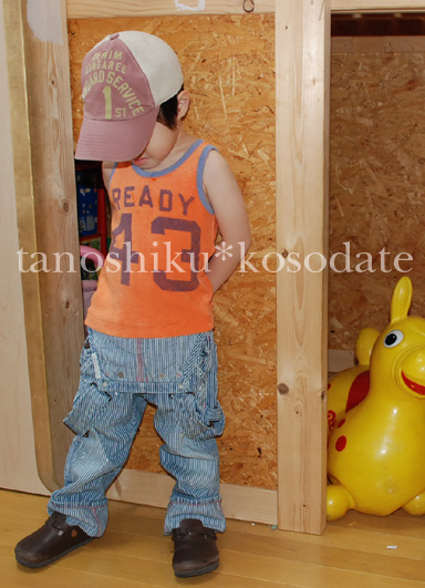 着用させてみました~。かわいい~~。やっぱりこのパンツ!!しかも真夏以外のオールシーズン使えるし(笑)お得だ~~。浅めにつくるために、スエット部分も大きくって子供にははきやすそう。ただもう少しゴムが太ければなぁ・・って感じ。どうしてもずりおちてきちゃう。(たぶん重いから)朝ななを園に送りにいく時、同じバス待合のおばあちゃんからあら~ズボンおちてるよ。とOVをあげられそうになった(笑)デザインなんで・・(とは言わなかった・・)あとわかってたけど、丈が長いから6.7cmぐらい折ってます。これはしょうがない。冬もおかげではけるはず。あとウエストちょっと細身っぽいです。いつもDDのボトム ウエストきゅーーーってアジャスター閉めるけど、これはアジャスターなし。スエットPNっぽい感じなので、紐だけです。ウエスト部分わかりやすいように、まくってもらいました。ぽっこりお腹ですが(笑)身長93、4cm ヒッコリーOV 100 パイルタンク BM90パイルタンクは聞いてたとおり大きかった~。かなり伸びる素材なので、BMで大丈夫そう。早くキャップ入荷しないかしらね~。