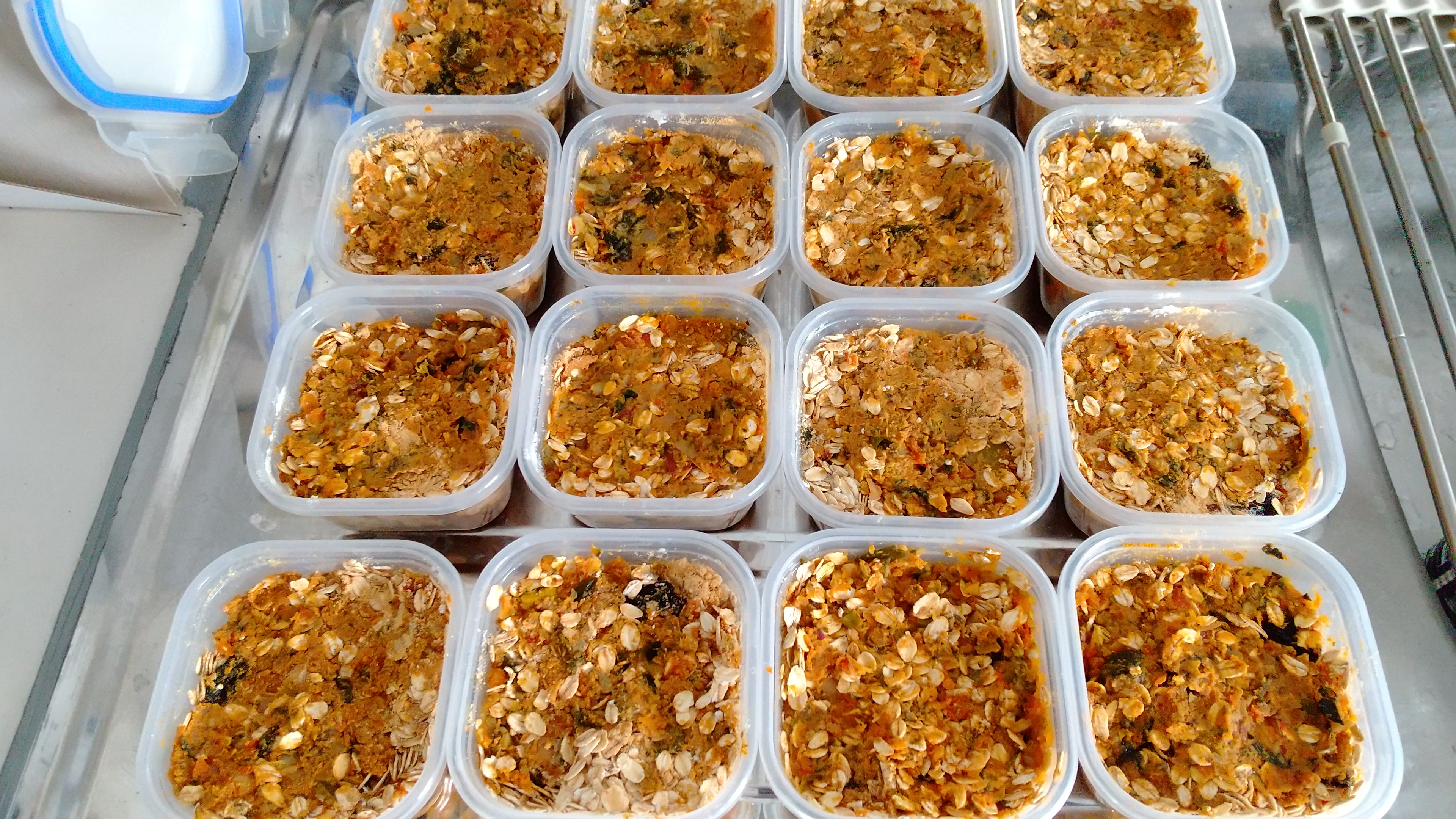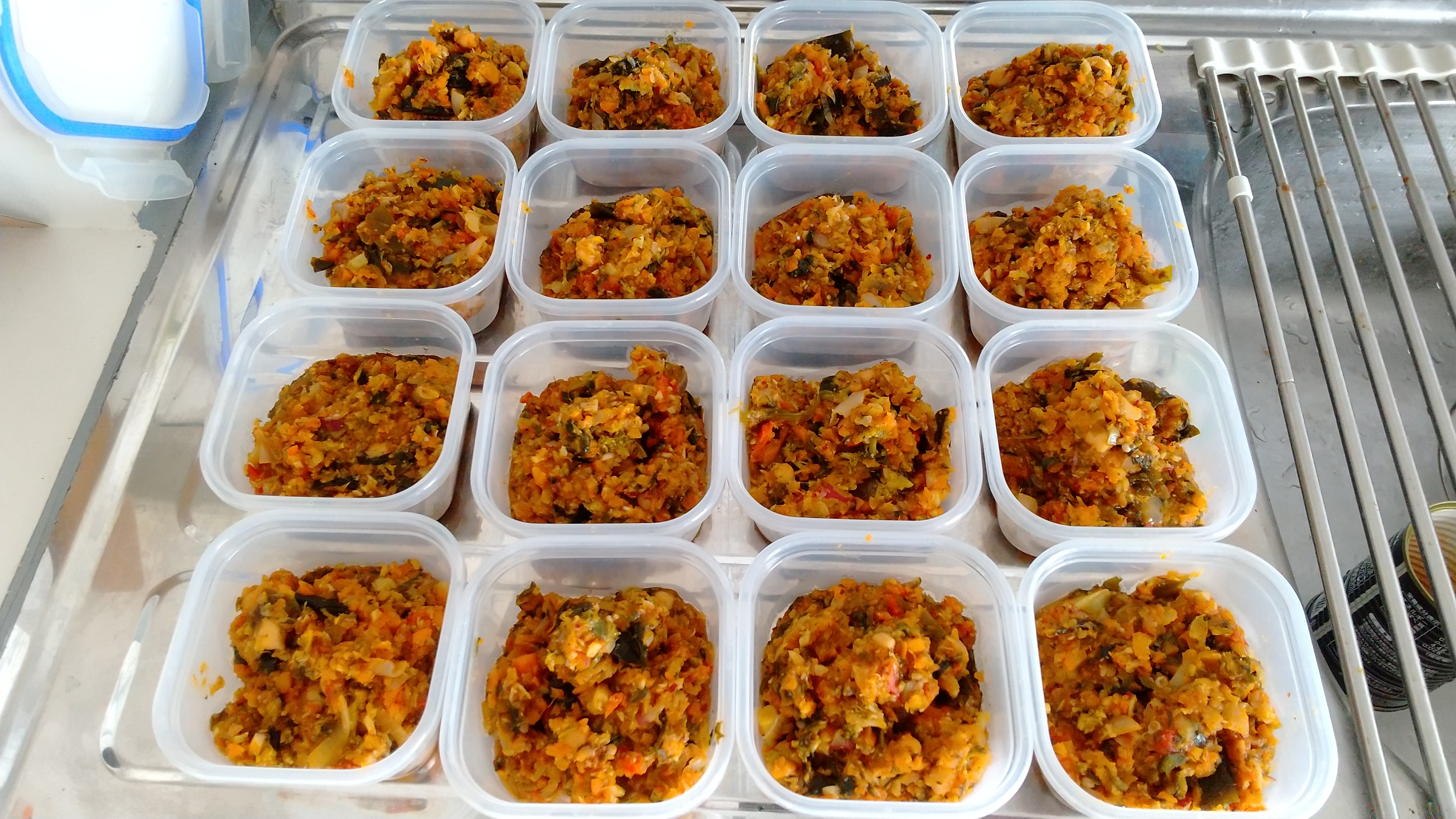 2025年01月31日に作成・開封済みの冷凍野菜を全消費することが目的・常温保存している野菜はさつまいもだけになった・冷凍する必要の無い乾物類は除外した(食べるときに追加する)・今回限りのレシピなので原価計算と栄養価計算は省略■分量(16食分) 野菜4425g+水300g=4725gにんじん 663gたまねぎ 1038gたまねぎ 315g菜の花 390gオクラ 240gかぼちゃ 258gほうれんそう 282gひよこ豆 273gしいたけ 303gナス 263gトマト缶 1缶(固形240g+液体160g)水 300gひよこ豆以外の食材をフードプロセッサーで刻んだあと、水300gを加えて中火で30分加熱。たまねぎは茶皮ごとフードプロセッサーにかけてみたやはり水を入れたほうが上手く加熱できる■1食(野菜276.5g)あたり熱量 118kcalたんぱく質 6.1g脂質 1.8g炭水化物 25.0g食物繊維 9.1g乾物類(カットわかめ、きな粉、オートミール)は食べるときに追加して加熱調理する計量:4分冷凍野菜の電子レンジ解凍:10分(全然たりなかった)生野菜フードプロセッサー:15分冷凍野菜フードプロセッサー:8分鍋に入れてガスで加熱(中火):30分食器洗いと掃除:10分小分け作業:8分食器洗いと掃除:4分なにかしら作業している時間が約50分かかる料理でした