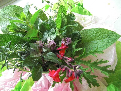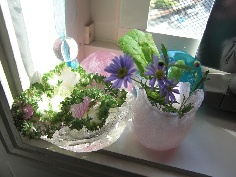 やわらかな朝の光 パインの床にも光が差し込んで。。。。 収穫しました ルッコラ・サニーレタス・セロリ・パセリ からし菜・高菜 美味しいサラダが作れそう 食べる前に。。。可愛いので ブーケのように。。。。アレンジ 食べれなくなりそう やっぱり。。。可愛い