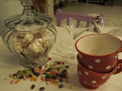 ローラ・アシュレイのガラスのビンに メレンゲのお菓子をいっぱい詰めました 赤いドットのカップも朝からたくさんのカフェオレが 飲めるかな アンティークのスチール書類ケース その中にお花を入れて
