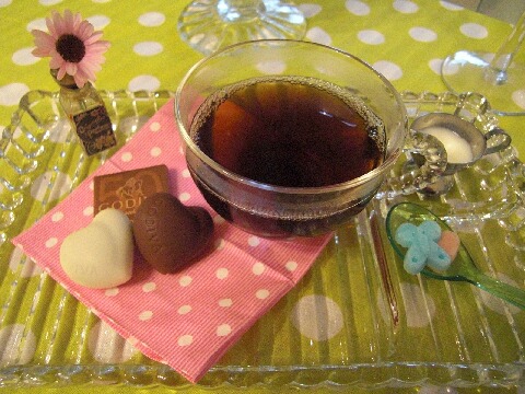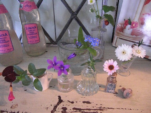 お友達から頂いた。。。ゴディバのチョコ ガラス食器がはなやかに アンティークの小瓶に1輪のお花で彩ります
