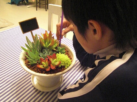 我が家の次男♪リッキー 2人でお花屋さんへ出かけ♪見つけてきたのが”多肉植物” よせ植えがしたいと言うので・・・・チャレンジしたところ なかなか・・・・センスいいのでは 親ばかなチッピーでした ストローで土を押し込んでいましたが♪そのストローもコーディネートしたそうです 色々な”多肉植物”を選んでいる時♪楽しそうでした 出来上がりはこんな感じですアロマキャンドルのやさしい香り・・・春のパーティでも活躍しそう~~