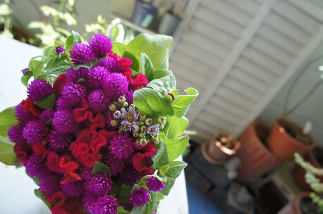 鮮やかな千日紅とケイトウ・・・・・・ 夏のお庭のお花もこれが最後かな・・・・・ 可愛いブーケの出来上がり クレマチスの種をお部屋の中で・・・・ 遊び心のある可愛らしいアレンジでしょ~~~~ ピオーネの果実をワイングラスに入れて 初秋のムードをテーブルに届けます・・・・ ぽちっとしていただけると嬉しいですにほんブログ村 いつも、応援ありがとうございます