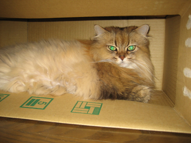 姿が見えないと思って探してみると、ダンボールの中でこの表情。