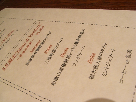 7月になっちゃいましたが・・・ようやっと写真アップバージョンをお届けでございますm(_ _)mどうぞお楽しみ下さい。6月21日の話ですが、お昼ご飯を食べに久しぶりにPAPA DAVIDEへ行きました。今回は6月限定メニューのセットを頂きました。野菜尽くしのとても健康的なメニューですねまずは「筑波産有機野菜のサラダ」 お皿にてんこ盛りの野菜に、恐らくバルサミコをベースとしたドレッシングでと~っても美味しい一品です次が「三浦野菜のズッパ」(ズッパはスープのことです)日によって、その日の最良の野菜を使ってスープを作るそうで暖かいスープの日もあれば、冷製スープの日もあるそうです。 ちなみに今日はズッキーニの温かいスープでした。ほのかに香るチーズが食欲をそそります。そしてメインのパスタ「和歌山産優糖星トマトと鎌倉野菜のフェデリーニ」3種類のソースから好きな物を選べるそうです。ちなみに我が家は・・・父がバジルソース 母がトマトソース 私が・・・何だっけ?オイルベース? 3種類それぞれ味わいましたが、どれも美味しくって強いて言えば、私が食べたオイルベース(?)が一番野菜の味が味わえたかな。最後のドルチェ(デザート)は「栃木産人参のタルトとミントジェラート」実際は人参のケーキだったように思いますが、人参チップがのっていて美味しいですミントジェラートも爽やかな味が口の中に広がってです。で、通常はこれにコーヒーか紅茶(100円プラスでカプチーノ)なんですが今回は我が家には「試食」と言うお仕事がありまして ティラミスのロールケーキの試作品だそうです。通常より濃いめのマスカルポーネチーズで作ったティラミスをコーヒーベースのスポンジケーキで巻いたそうです。ティラミスの味がしっかりしていてスポンジもふんわりしていて周りに散らしたコーヒーのパウダーを付けながら食べるとかなーり美味でございますロールケーキというと庶民で食いしん坊のアタクシは分厚く切って、手に持ってガブリとかぶりつきたい派ですがこのティラミスのロールケーキは少し薄めに切ってお皿に置いてフォークを使って食べる、上品な感じです。ま、良い意味で“大人のお菓子”だと思います。まだまだ改良中だそうなのですが、きっと近々店頭で販売されるでしょう。楽しみに待ってま~す