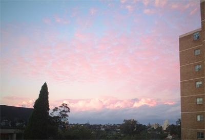 先週日曜日、ニコール・キッドマンの結婚式がマンリーで催された。夕方、3、4機のヘリコプターがマンリー上空を旋回しているのが、我が家のバルコニーから見えた。その後だんだんと太陽が沈みかけ、マンリー方面上空が赤く染まり始めた。彼女の結婚式を祝っているかのように、とてもきれいな光景だった。