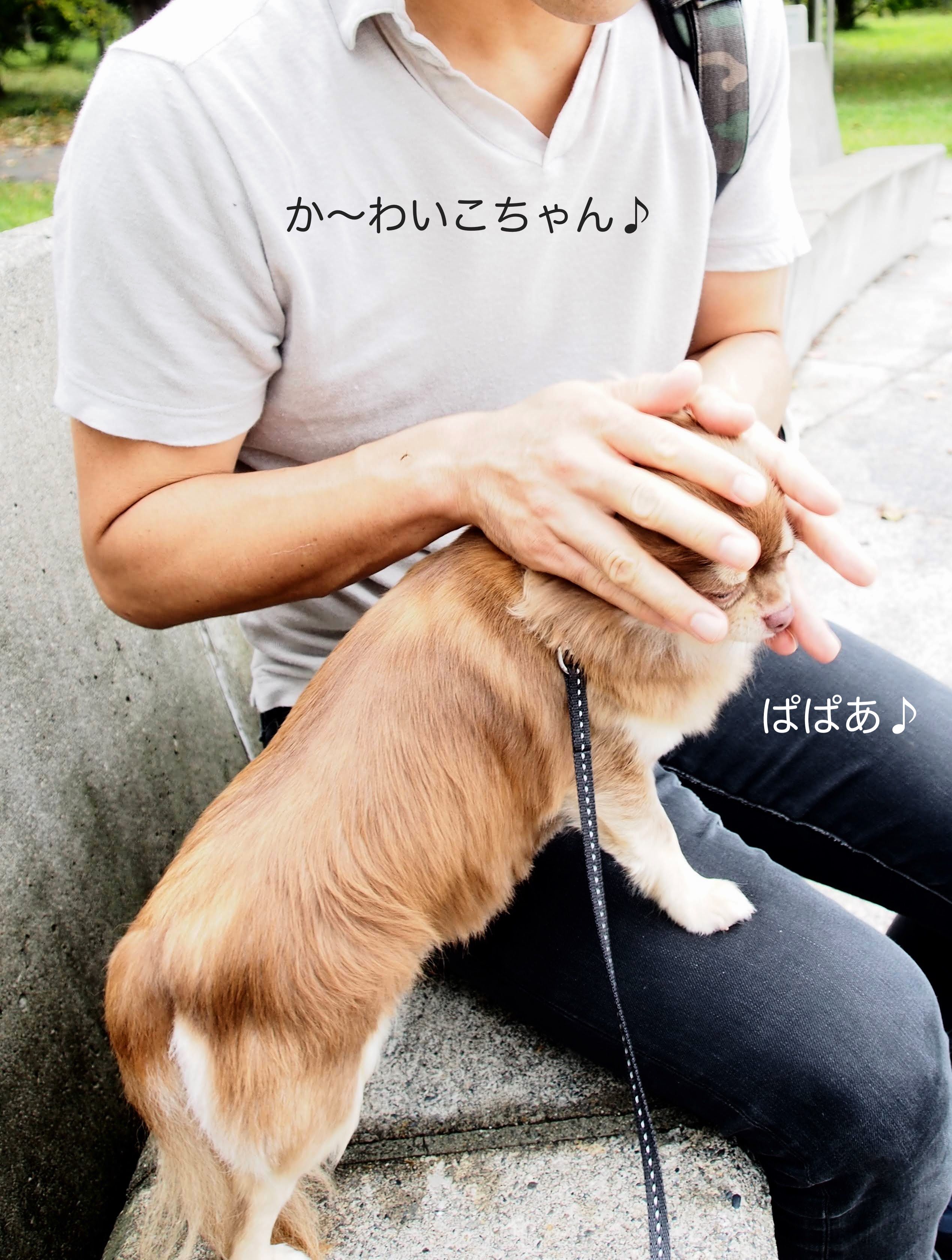 その日、私は聞いてしまったのです。夫が小さな声で、「真実の愛に目覚めてしまった」とつぶやいたのを。うすうす勘づいてはいました。夫は隠しごとができないタイプで、言動のはしばしに抑えきれない気持ちがにじみ出ていましたから。そして、相手のほうもまんざらでもないことを。ついに恐れていた日が来てしまいました。そう、夫とチョコがラブラブになる日が。あ〜〜んチョコはあんなにお母さんっ子だったのに。ここのところ、夏休み、シルバーウィークと夫がチョコといる時間が長かったのです。そのうえ、夫はそもそもマメ男くん。チョコを振り返らせるためには労を惜しみません。まずはデート作戦。チョコをキャリーバッグに入れ、どこへでも連れて行きます。おやつや水、ピクニックシートなど準備も抜かりなし。バスや地下鉄を使って2人で遠出することもあるらしい。次に、プレゼント攻撃。休みのたびにペットショップに行っては、おやつ、おもちゃなど買ってきます。(そんなにいらんっ)この間なんか犬のお洋服の専門店に行き、チョコに似合う服を探すと、5枚も、6枚も試着させたあげく、その日私が着ていたシャツ(ユニクロですが)よりも高いパーカーを買いました。さらに、店内のかわいいスタジオにチョコを座らせパチリ↓そして、スキンシップ作戦。シャワーにいれ、マッサージし、ブラッシングをして、いいこ、いいこ、です。さすがのチョコもこれには、ほだされないわけにはいかないでしょう。ついに陥落したチョコに夫はもうメロメロ。こうして相思相愛の2人のできあがりです。今日も夫は「チョコに何日も会えないなんて耐えられない」と言いながら、出張にでかけていきました。うっふっふ。でもねえ、チョコ。パパにはチョコがくるまで可愛い恋人がいたんだよ。これこれ、ママの友達のワンちゃんのクレアちゃん。よくうちにお泊まりに来てて、こうやってパパとも仲良しだったんだよ。札幌に転勤って決まった時なんか、パパもうクレアに会えないってしょげてたんだよ。うふふ。今はチョコが一番かもだけどね。パパはわりと惚れっぽいんだよ。それにしても、真実の愛ってのにひっかかるわ。12年の結婚生活では目覚めなかったのかしら?ブログランキングに参加しています。応援クリックをいただけますととても励みになります。にほんブログ村↓よろしければ読者登録もお願いします。