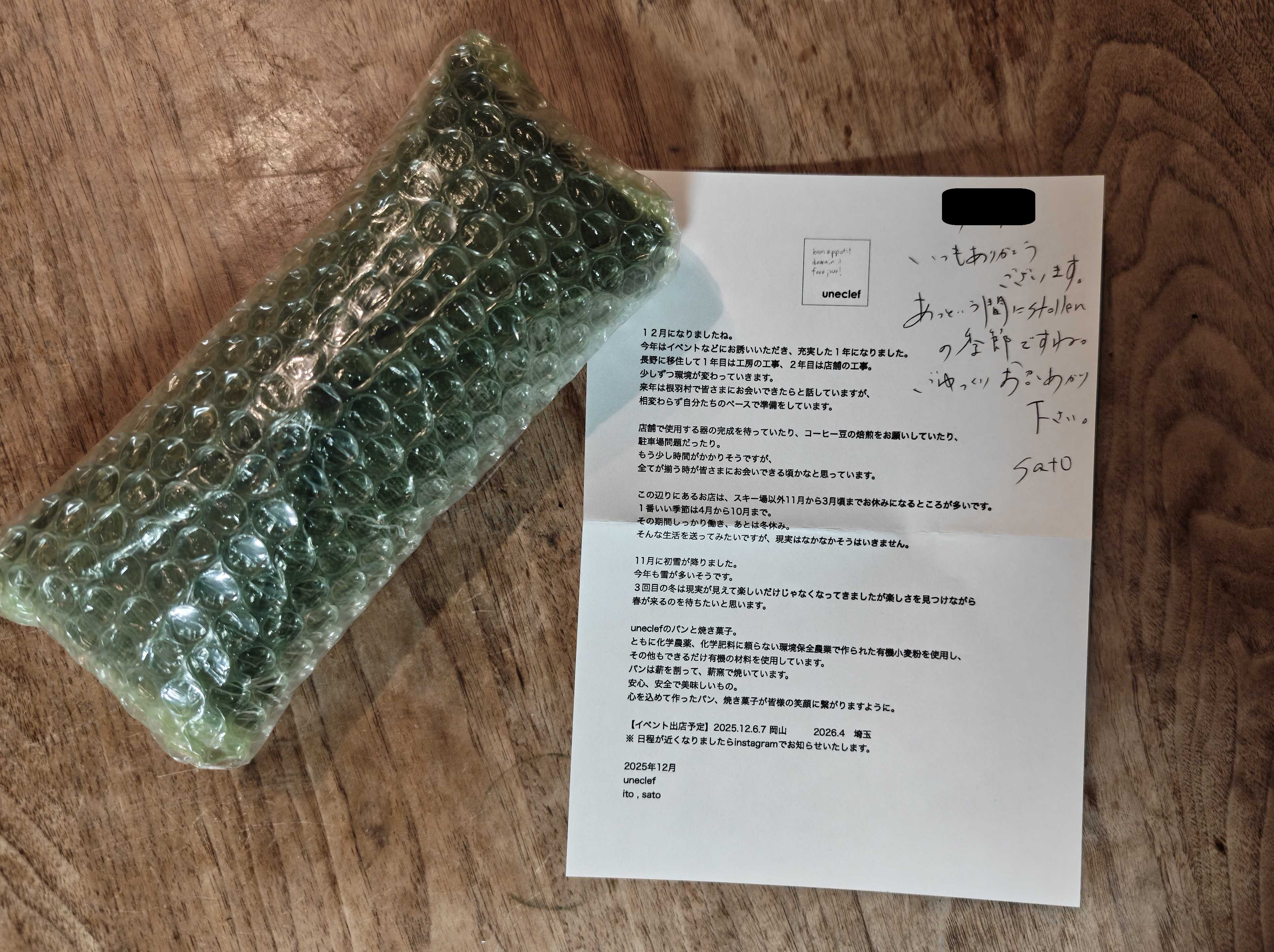 今年もユヌクレさんからシュトーレンが発売されたので公式オンラインショップで購入しましたユヌクレさんで通算18回目の通販シュトーレンは毎年売り始めの頃はかなり激戦で買えないのですが、回数を重ねると少し余裕が出て来て買いやすくなる気がします今年も11月の終わりくらいから売っていて、私が購入できたのは12月14日ちょうどBASE13周年大感謝祭クーポンキャンペーンがやっていて15%オフで購入出来てラッキーでした15日に発送されて、16日に千葉で受け取りましたStollen / spice(4860円からBASEのクーポンで15%オフ+千葉までのヤマト常温便送料720円)原材料名 / 有機小麦粉(北海道産)、バター(北海道産)、喜界島の粗糖(喜界島産)、生クリーム(埼玉県産)、有機アーモンドプードル(アメリカ産)、自家製ルヴァン種、発酵種、有機粉糖(ブラジル産)、カンホアの塩(ベトナム産)、有機胡桃(アメリカ産)、有機ヘーゼルナッツ(トルコ産)、有機白無花果(トルコ産)、有機クランベリー(カナダ産)、有機サルタナレーズン(トルコ産)、有機アプリコット(トルコ産)、有機マンダリンオレンジ(トルコ産)、有機赤ワイン(フランス産)、有機ラム(ドミニカ産)、有機シナモン(スリランカ産)、有機カルダモン(スリランカ産)、有機ジンジャー(ベトナム産)、有機ナツメグ(スリランカ産)今年もやっぱり美味しくてあっという間に食べちゃうサクサクの表面にナッツや果物がたっぷりサクサク食感は去年よりも軽い感じになった気がします材料も少し変わっているからかないろいろ入っているからちゃんとはわからないけどナッツも果物もスパイスもどれもたっぷりと感じられて、強すぎず優しくまとまっています息子も大好物のシュトーレン私は薄切り派だけど、息子は2cm以上の厚切り派「美味しい、美味しい」と今年もお気に入りでしたごちそうさまでした今年は結局ここでしかシュトーレンを買えなかったけど、美味しいのが買えて良かったまた来年も買えるといいなユヌクレ(uneclef)長野県根羽村https://www.instagram.com/uneclef/