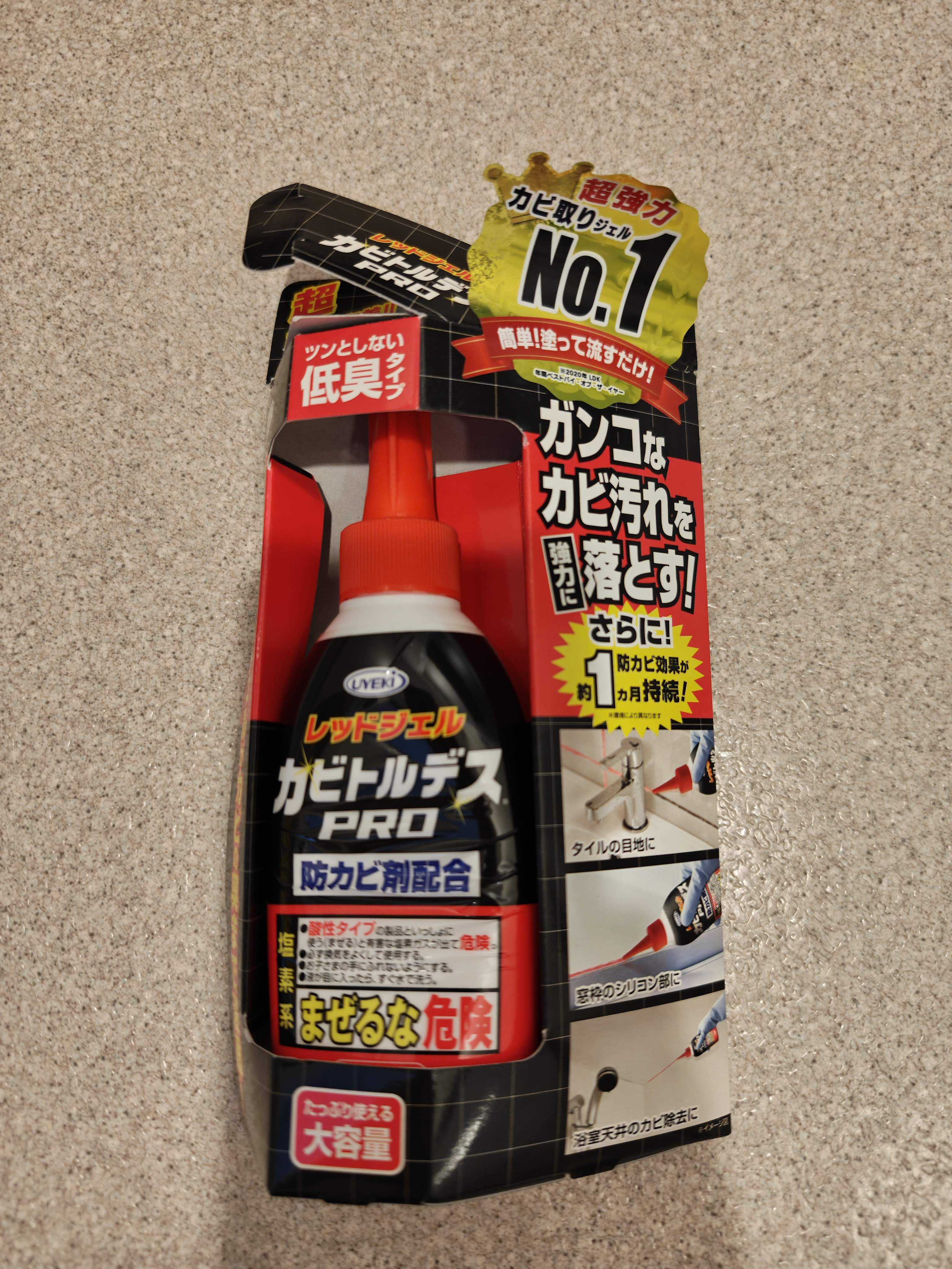 一昨年楽天市場で購入してから我が家の大掃除の定番のカビトルデスPRO使用前と使用後の写真を撮ろうと思って忘れちゃったけど、黒くなってちょっと放置しちゃったカビもキレイに取れて大活躍しますしつこいカビで調べて、キッチン泡ハイター+キッチンペーパー+ラップ をやってみても、ほとんど変化が無かった黒カビが1時間半くらいの放置でほぼほぼピカピカに回しものじゃないけど、これはおススメしたいですUYEKI カビトルデスPRO 90g カビ取り 強力ジェル状カビ取り剤 カビトルデスプロ カビ取り剤 カビとり カビ取りジェル 掃除グッズ 掃除用品 お風呂掃除 お風呂掃除用品 防カビ 防カビ剤 高所 タイル 低刺激 洗面所 洗面台 トイレ トイレ掃除用品 水回り