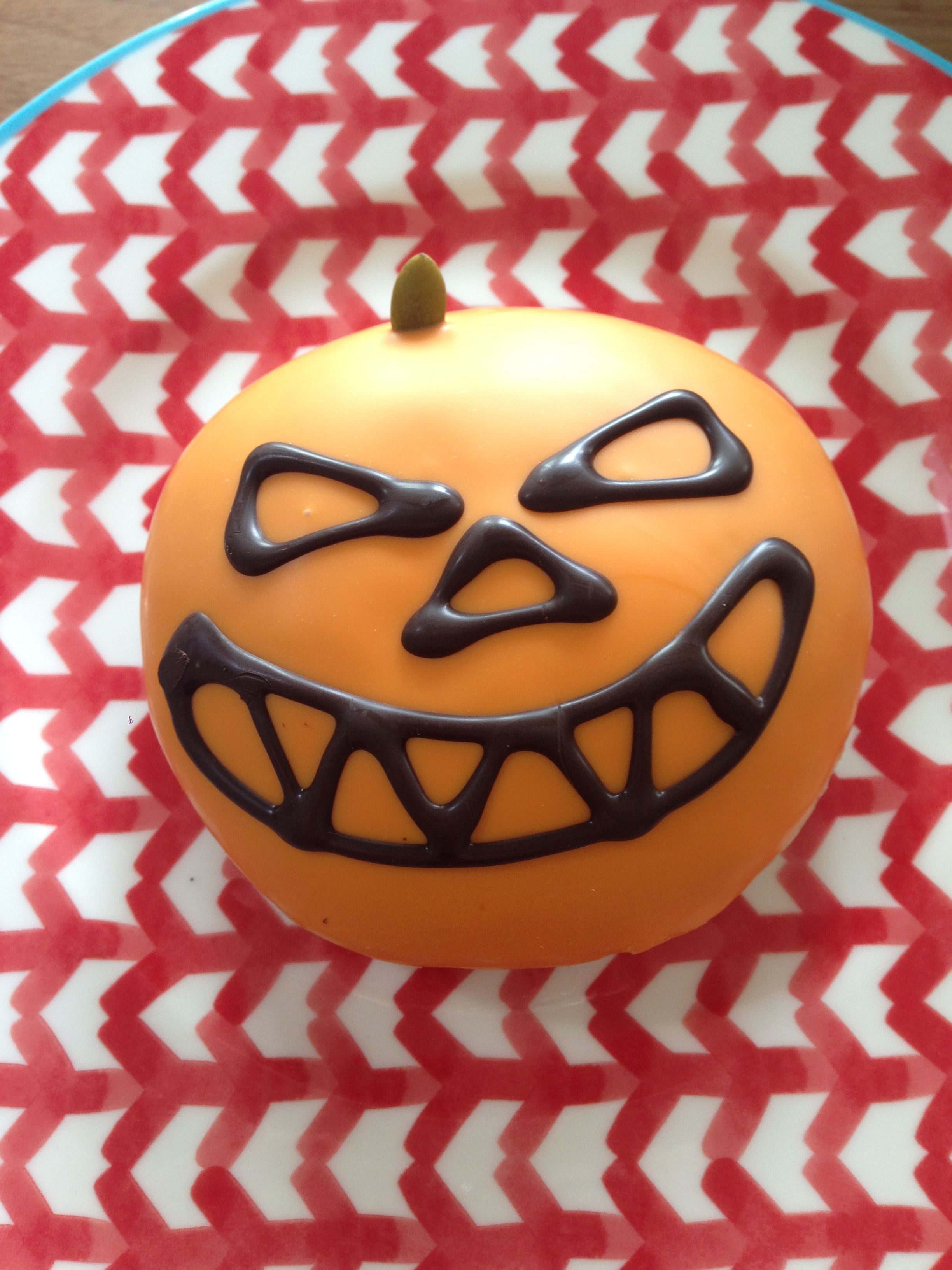 クリスピークリーム独特のフワモッチリした生地の表面にカボチャ風味のチョコでジャックオランタンが描かれています