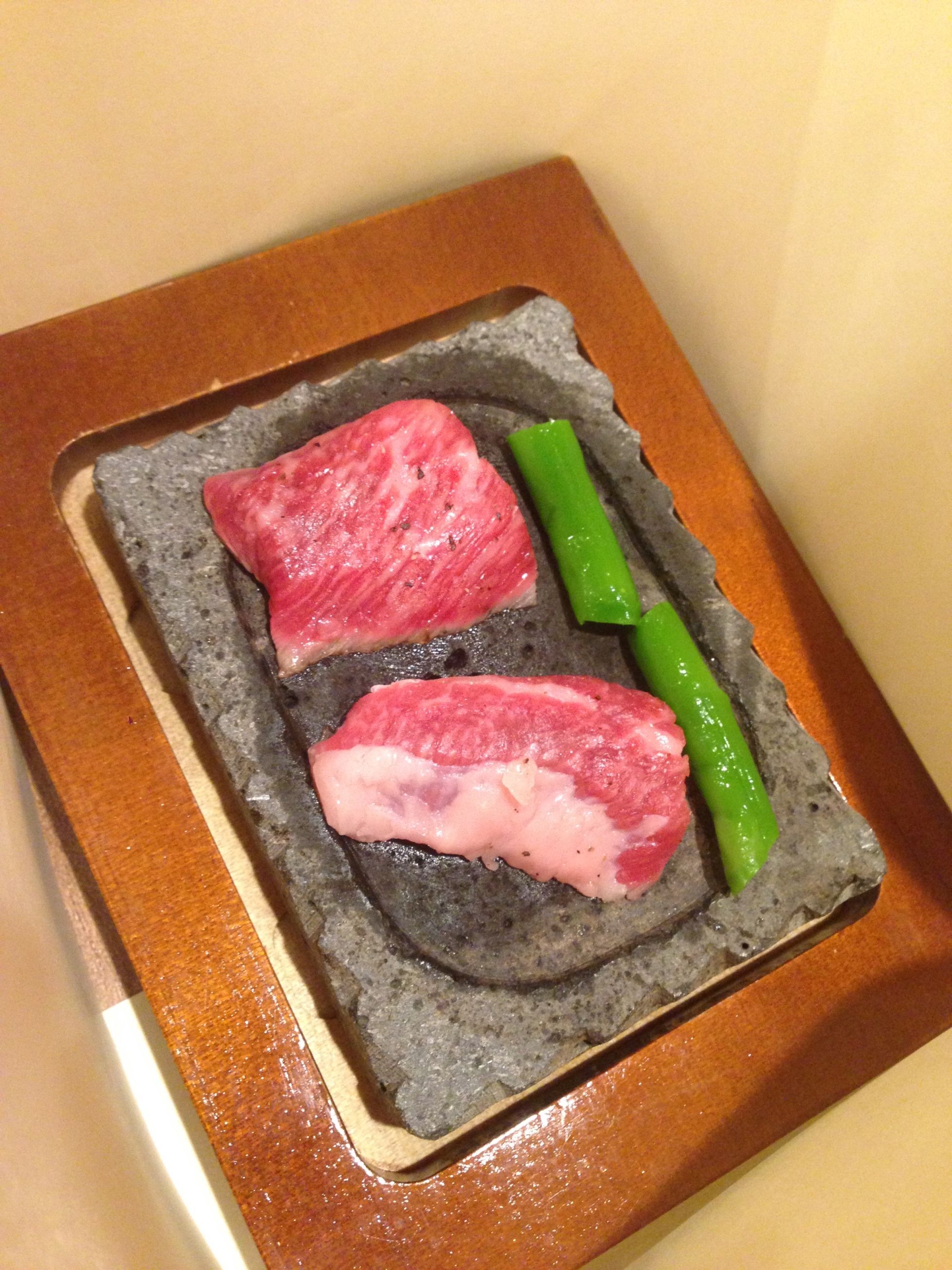 「お熱いのでお気を付けください」という溶岩プレートに、和牛とアスパラをのせて焼きました。