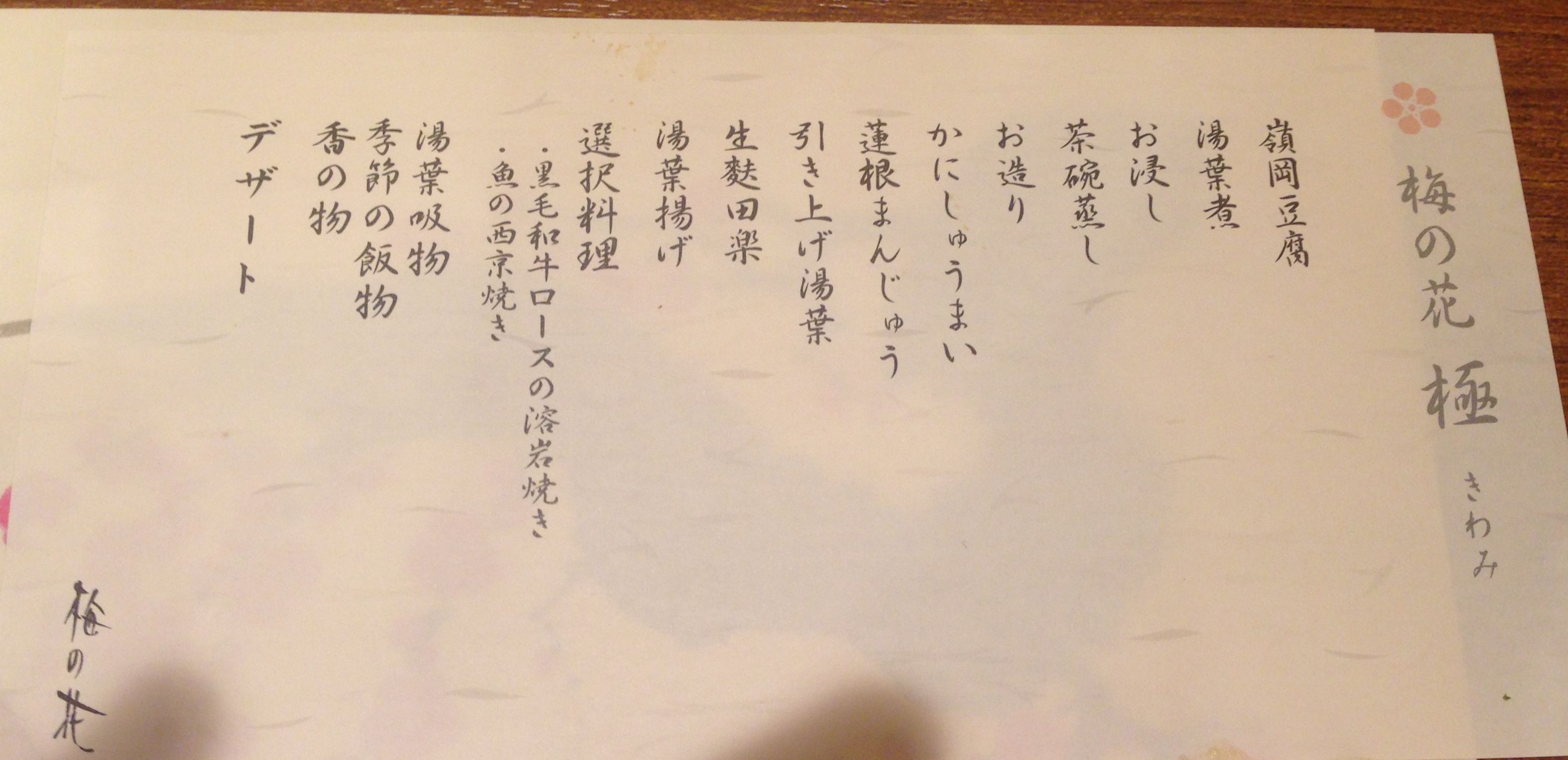 10/31までの特別価格で梅の花「極」という懐石が5720円のところ1000円引きで4720円になるということ