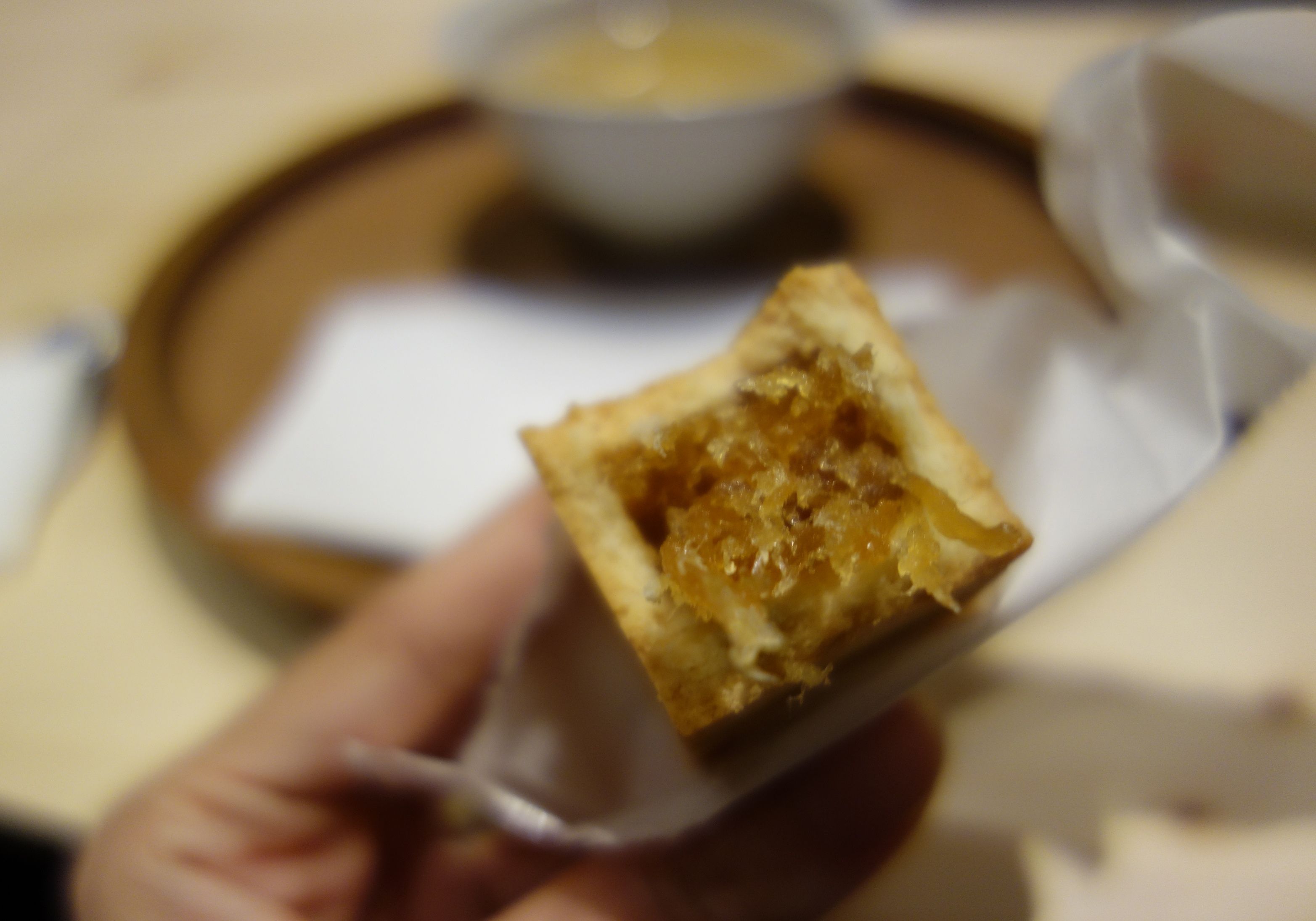 パイナップルケーキは素朴な感じのさっくり生地の中央にパイナップルががっつり入っている感じ。