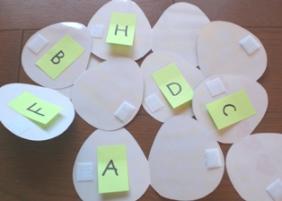 今年度のレッスンも残りわずか最近年長クラスではアルファベットの復習をしています復習の方法は色々あるけれど、今回はイースターも近いということでイースターエッグを使いましたまず、玉子の中にポストイットに書いた大文字を貼り、小文字を教室の壁に貼り付けておきます↓ ↓ ↓玉子を閉じて生徒に一枚選ばせ、中を開けて"What's this letter?"答えられたら、"Try to find the small 'd'."小文字を探して大文字とペアになるように玉子の中に貼ります↓ ↓ ↓出来たら次の玉子を開けてアルファベット探しをしましたみんなすごい勢いで探してたポストイットだから何度も繰り返し使えて便利にほんブログ村