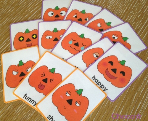 今週の年長クラスはパンプキンカードを使ってadjectivesを学びます。クラフトショップにも出しているパンプキンシートを切り取り、9枚のカードにしたものに絵本に出てくる3つの形容詞をプラスしてビンゴにチャレンジしました自分でカードを3×3に並べてビンゴシートを作り、私が言う単語のカードを裏返していきました。このくらいの枚数だとあっという間に終わるのでサクッとアクティビティが楽しめます。以前習ったことがあるhappy, sad, angryはバッチリ。scaredは先週までscary monsterのフレーズを散々口ずさんでいたのでまだちょっとscaryと混ざってますが言うことができます。残りの形容詞はまだスムーズには出てきませんが聞き取りはほぼできている感じがしました。今後のレッスンにつなげるために今回はいつもよりも多めの単語を出してます。ちょっと大変だけどがんばって覚えましょうね!ほめられるとものすごく嬉しそうで得意げな年長さんたち。聞いて話せる言葉が増えるとさらに楽しくなりますよ手づくり教材はこちらブログランキング参加中こちらをポチっと応援お願いします