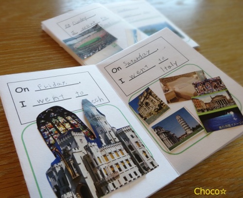 先週から作っている過去形を使った【夢の旅行】絵本が完成しました!ふと見るとNちゃんが選んだ国でチェコとイタリアが並んでる!この二つの国は去年と今年Choco先生が旅したところ。でもNちゃんは国名ではなく街並みで選んでいたのでたまたま重なっただけです!長年教えてると好みも似てくるのかな~(*^▽^*)今日は参観レッスンだったのでこの本をママに見せながら自分の行った国自慢をしました。ママにピッタリくっついて話す姿がほのぼのしててすごく可愛かった!4年生になってもまだまだ素直な子供たちです♪来週は【夢のお部屋】を考えます。どんな楽しい空間が出来上がるかまたまた個性が光りそうです。手づくり教材はこちらブログランキング参加中こちらをポチっと応援お願いします