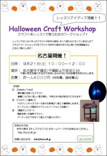 手作り教材キッズクラフトの【ハロウィンワークショップ】を来月名古屋で開催します!今回ご紹介するのは3つの手作り教材。懐中電灯を使った光と影のクラフト ・Spooky Tubeハロウィンキャラクターのオモシロおかしな表情が一度に楽しめる・ハロウィン福笑い*ワークショップスペシャルバージョンです!ハロウィンパーティーなどで子どもと一緒に簡単に作れる・風船モンスター++++++++++++++++++++++++++++ワークショップでは一緒に教材を作ってからアクティビティを体験していただきます。 日時 : 9月21(土) 10:00~12:00 場所 : 名古屋市千種区 参加費 : お一人 4000円(材料費、諸経費込)詳しくは【キッズクラフト】のホームページをご覧ください★下の画像をクリックしていただくとチラシをご覧になれます★++++++++++++++++++++++++++++東京開催は9/29(日)となります。詳細が決まり次第ホームページおよびブログにて告知させていただきます。手づくり教材はこちらブログランキング参加中こちらをポチっと応援お願いします