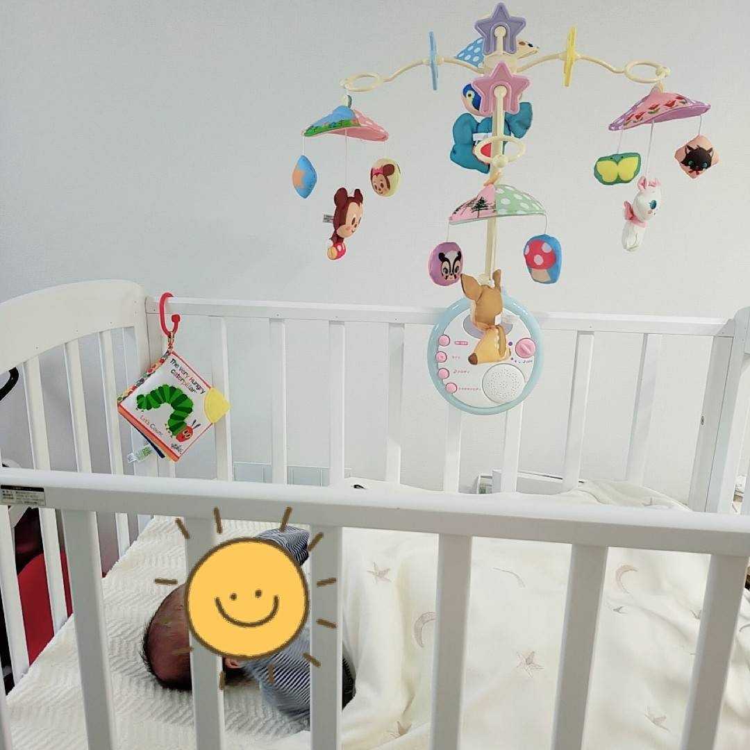こんにちはかわちゃんパパです。最近ちび太郎がどんどん成長してきて、小柄なママでは抱っこするのも大変になってきました(;^_^Aかといって、さみしがり屋さんなのか抱っこしてないとすぐ泣き出すし・・・大変かつ楽しい毎日を過ごしています。そんな中我が家にも待望のメリーが到着しました。タカラトミー ディズニーキャラクターズ やわらかガラガラメリーデラックス【送料無料 沖縄・一部地域を除く】早速開封してみました。組み立ても簡単だったので、苦手な方でも大丈夫そうです!好き嫌いがありますし気に入ってくれるか不安でしたが、すごく楽しそうに遊んでくれました!実際にベッドに取り付けた写真はこちら夢中でメリーを見てくれています。また、人形がプラスチックではなくぬいぐるみになっていて取り外し可能でガラガラと音が鳴るのでメリー以外にも使い道がありそうです。起きているときは抱っこしていないとすぐに泣き出してしまう甘えん坊さんのちび太郎も、これを購入してからは手足を振って遊んでくれるようになりました。おむつを取り替えるときもよく暴れて泣き出してしまうのですが、これがあると落ち着いてくれています。視覚や聴覚の知育にも良いかと思いますし、なによりかわいいです(笑)電池の寿命が20時間程度しかもたないのが欠点ですが赤ちゃんから目が離せない状況から抜け出せたただけでも購入してよかったと思っています♪*-*-*-*-*-*-*-*-*-*-*-*-*-*-*-*-*-*-*-*-【送料無料】アンパンマンも可愛かったのですが、素材がプラスチックだったので布タイプのこちらにしました!音楽は「星に願いを」「ミッキーマウスマーチ」の他3つのメロディー、「鳥のさえずり&川のせせらぎ」「胎内音」の2つの環境音が搭載されています。夜のおむつ替えに役立つライトが付いているのも便利です!タカラトミー ディズニーキャラクターズ やわらかガラガラメリーデラックス【送料無料 沖縄・一部地域を除く】