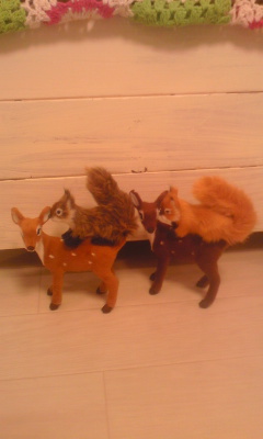 今日我が家に可愛い子達がやってきました!! どこに飾ろうかと考えててたら 我が家の悪ガキが バンビの上にリスのっけてこれがいい!って(*_*) で、ここに飾りました(^^) 可愛い~o(^-^)o